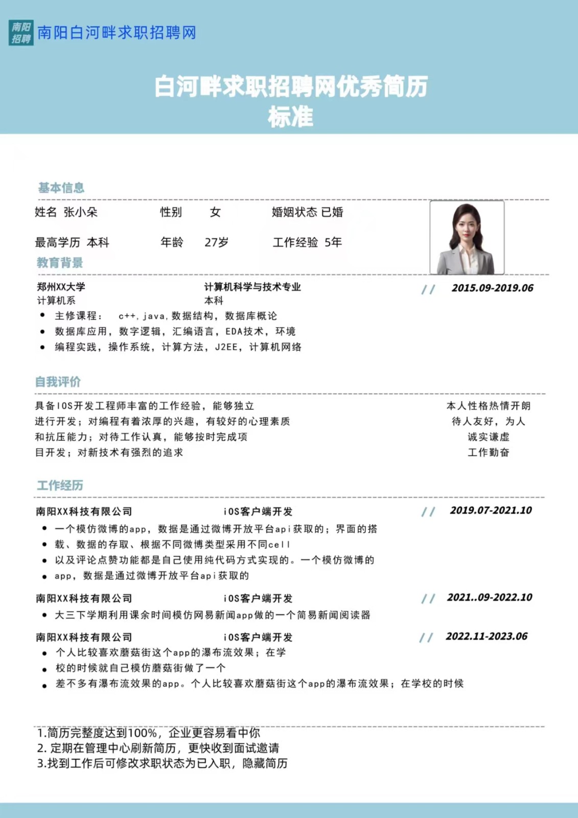 为了帮助人才更好的展示自己,更快速找到工作,南阳白河畔求职招聘网发布优秀简历标准如下: